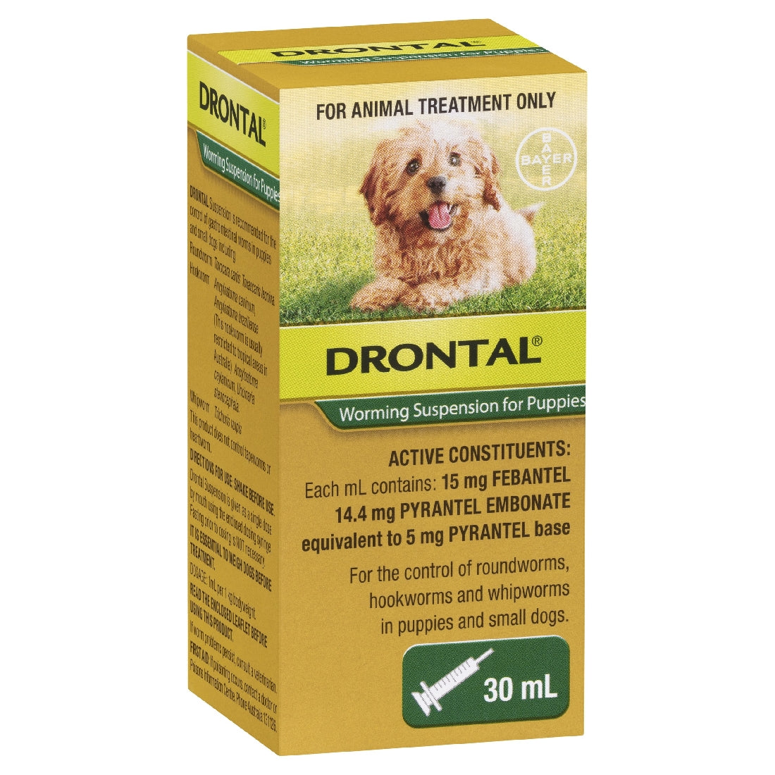 Drontal Worming Suspension for Puppies is recommended for the control of roundworms, hookworms and whipworm in puppies and small dogs. Puppies can be infected while in-utero (roundworms) or through the milk during feeding (roundworms and hookworms), therefore, it is important to treat puppies frequently until at least 12 weeks of age^. Drontal Worming Suspension is the easy way to dose young puppies and small dogs, and is safe for use from 2 weeks of age. Fasting is not required prior to administration. This product can be safely combined with other flea, tick and heartworm control products, and Droncit if tapeworm control is required.