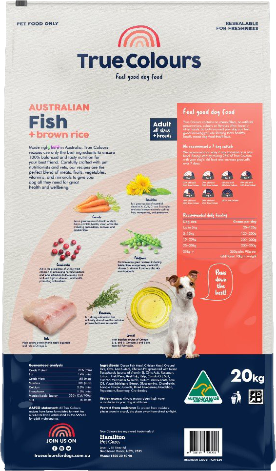 Give your dog premium, natural nutrition with True Colours Fish & Brown Rice Adult Dry Dog Food, proudly crafted in Australia. Free from artificial colours, preservatives, hormones, and GMOs, this complete recipe provides balanced, wholesome nutrition for your adult dog.